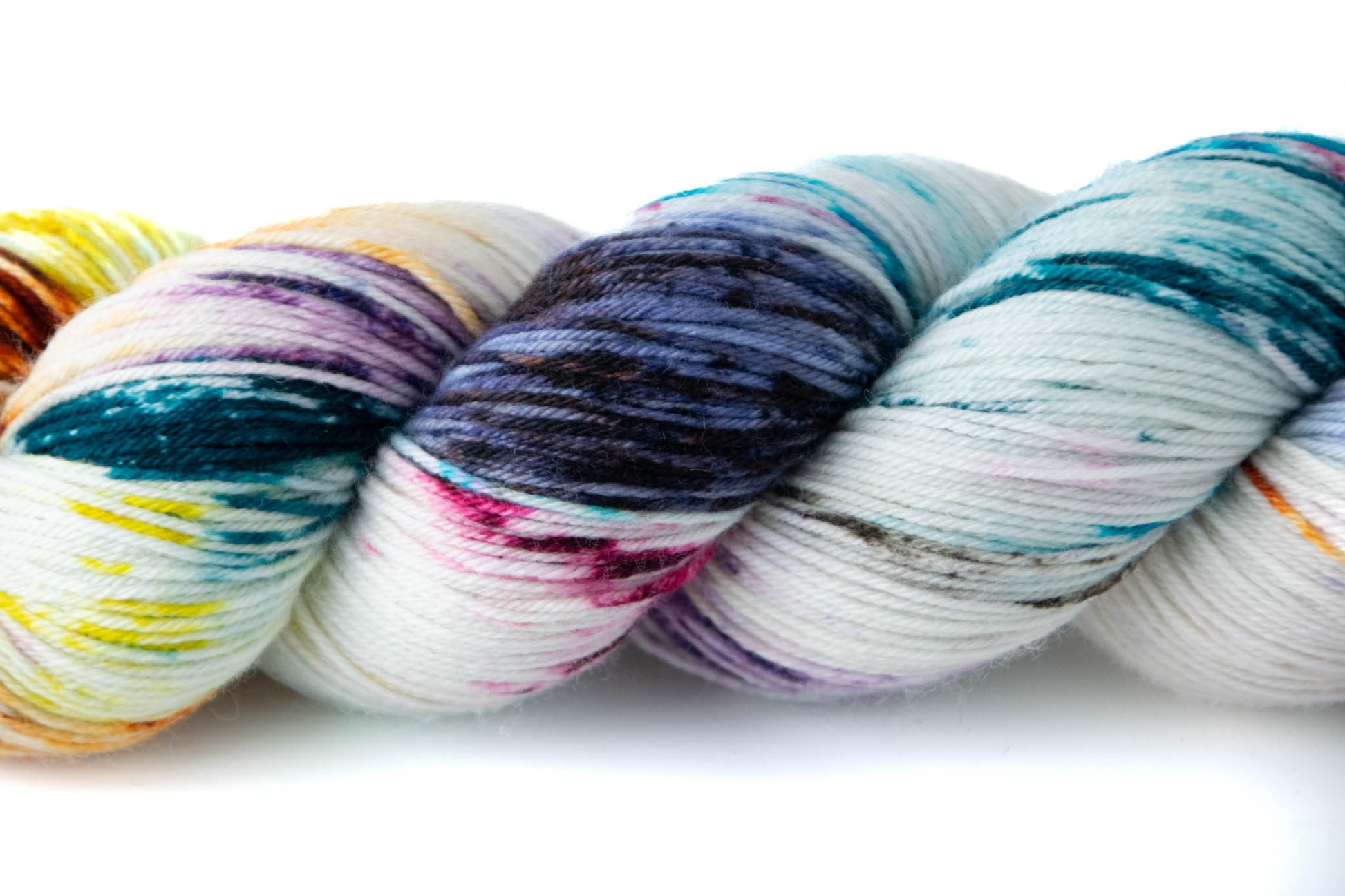 This is your invitation to reactivate your childhood imagination! Neighborhood of Make-Believe is a highly variegated colorway with many multi-colored sections on a white background. This colorway is part of the dyed-to-order Neighborhood collection and has a turnaround time of up to four weeks.